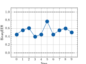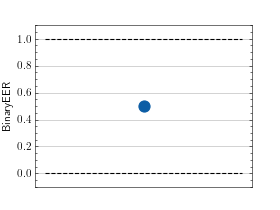\[\text{EER} = \frac{\text{FAR} + (1 - \text{FRR})}{2}, \text{where} \min_t abs(FAR_t-FRR_t)\]The Equal Error Rate (EER) is the point where the False Positive Rate (FPR) and True Positive Rate (TPR) are equal, or in practise minimized. A lower EER value signifies higher system accuracy.