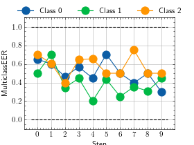 >>> # Example plotting multiple values >>> import torch >>> from torchmetrics.classification import MulticlassEER >>> metric = MulticlassEER(num_classes=3) >>> values = [ ] >>> for _ in range(10): ... values.append(metric(torch.randn(20, 3), torch.randint(3, (20,)))) >>> fig_, ax_ = metric.plot(values)
