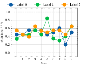 >>> # Example plotting multiple values >>> import torch >>> from torchmetrics.classification import MultilabelEER >>> metric = MultilabelEER(num_labels=3) >>> values = [ ] >>> for _ in range(10): ... values.append(metric(torch.rand(20,3), torch.randint(2, (20,3)))) >>> fig_, ax_ = metric.plot(values)