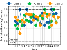 >>> # Example plotting multiple values >>> from torch import rand, randint >>> from torchmetrics.classification import MultilabelHammingDistance >>> metric = MultilabelHammingDistance(num_labels=3) >>> values = [ ] >>> for _ in range(10): ... values.append(metric(randint(2, (20, 3)), randint(2, (20, 3)))) >>> fig_, ax_ = metric.plot(values)