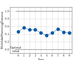 \[\text{Hamming distance} = \frac{1}{N \cdot L} \sum_i^N \sum_l^L 1(y_{il} \neq \hat{y}_{il})\]Where \(y\) is a tensor of target values, \(\hat{y}\) is a tensor of predictions, and \(\bullet_{il}\) refers to the \(l\)-th label of the \(i\)-th sample of that tensor.