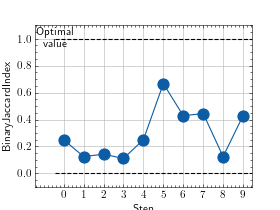 >>> # Example plotting multiple values >>> from torch import rand, randint >>> from torchmetrics.classification import BinaryJaccardIndex >>> metric = BinaryJaccardIndex() >>> values = [ ] >>> for _ in range(10): ... values.append(metric(rand(10), randint(2,(10,)))) >>> fig_, ax_ = metric.plot(values)