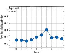 >>> # Example plotting multiple values >>> import torch >>> from torchmetrics.clustering import FowlkesMallowsIndex >>> metric = FowlkesMallowsIndex() >>> values = [ ] >>> for _ in range(10): ... values.append(metric(torch.randint(0, 4, (10,)), torch.randint(0, 4, (10,)))) >>> fig_, ax_ = metric.plot(values)